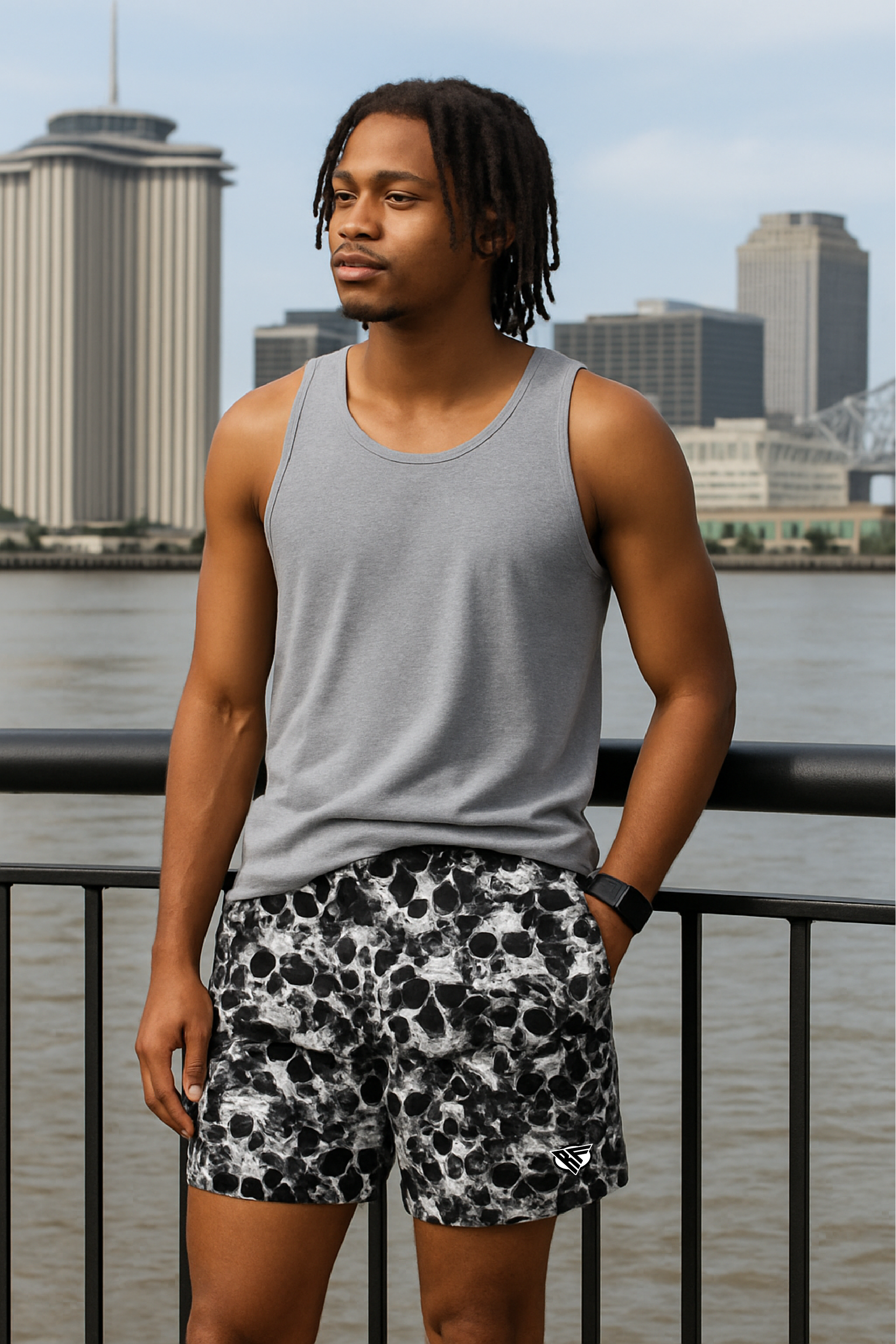 RF Wear Men's Mesh Reflective Barb Wire Shorts - Black/Grey - Model Front View